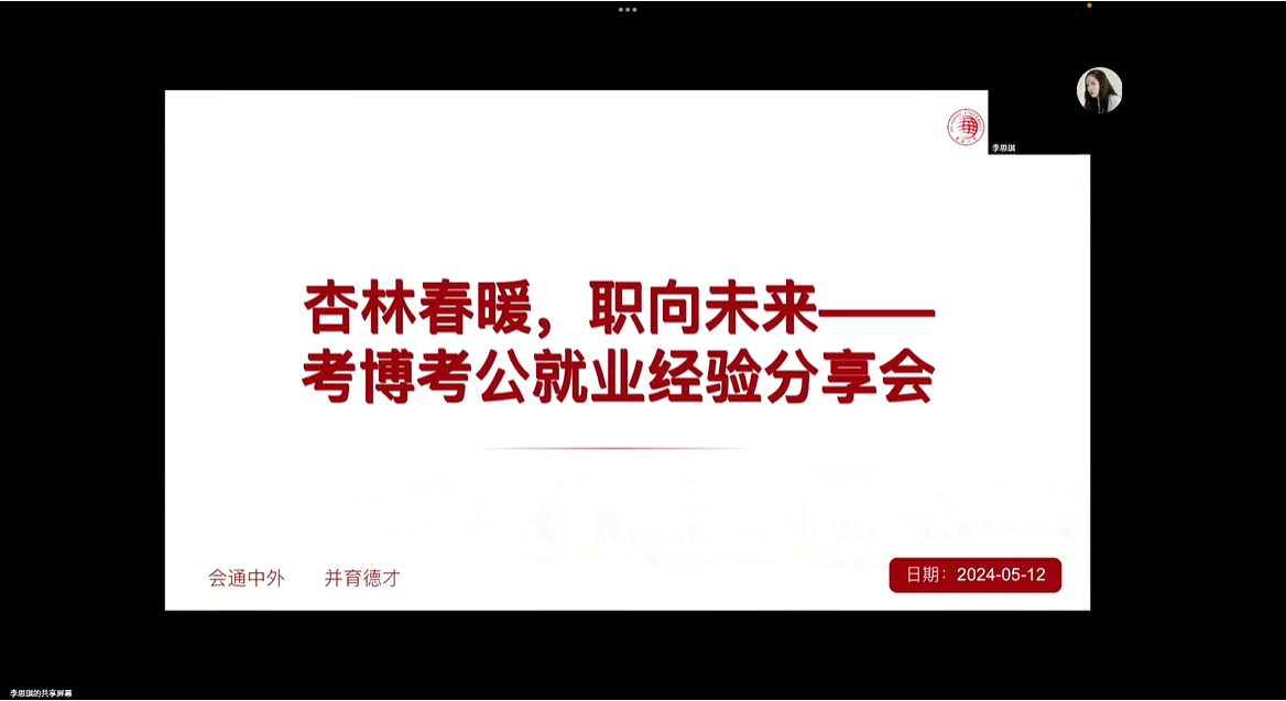 2024.5.12日(周日) 14:30,由华侨大学研究生会主办、华侨大学医学院协办的2024年华侨大学“杏林春暖,职向未来-申博考公就业经验分享会”活动成功举办。本次活动邀请到了华侨大学医学院余兴波、张健松及曾攀等三名优秀学生代表,分享他们的备考经验、学习心得、应试技巧及职业规划相关知识,解答大家关于申博、考公以及求职就业过程中的疑惑,帮助在校学生了解当前升学、就业形式,尽快认识自我,以便对未来进行更好地规划。