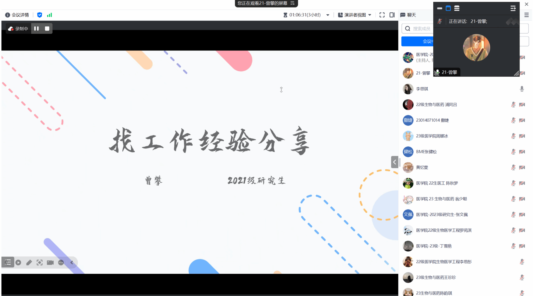接下来是2021级生物与医药硕士研究生张健松学长,他分别从申博时间点、院校及导师选择、基本申请要求及研二下学期应该如何度过等方面进行经验分享,学长特别指出在院校及导师选择上,相对应该遵循导师、研究兴趣、学校层次的顺序进行,通过三选二原则,若有两个条件满足预期即可报名。研二下学期可以通过完成小文章的发表、完成硕士论文、实习等任务或者参加各种比赛以提高自己的申博可能性。